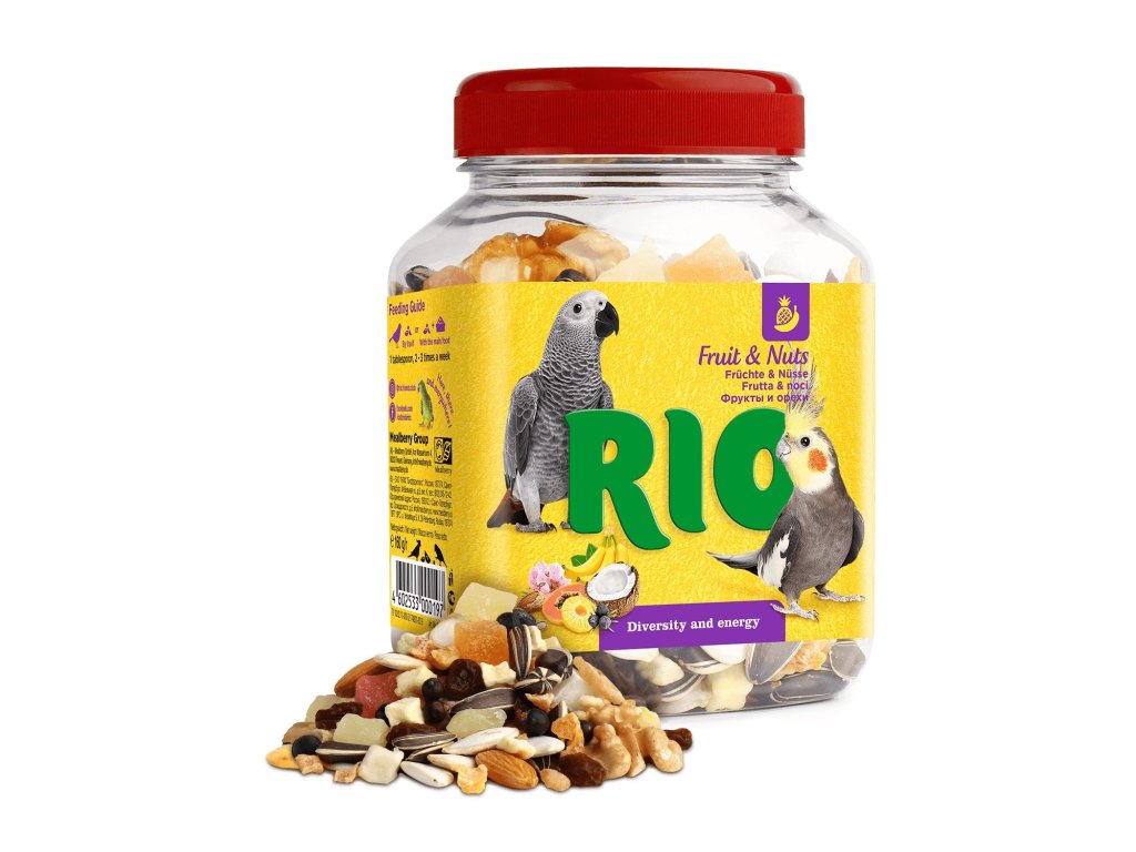 RIO směs ovoce a ořechů 160 gTato lahodná a zdravá směs ovoce a ořechů se skládá z přírodního sušeného ovoce, křupavých ořechů, lesních plodů a semínek, které mají rádi andulky a papoušci. Tento pamlsek je vynikajícím zdrojem dodatečné energie, vitaminů, makro a mikroprvků a přináší rozmanitost do každodenní stravy ptactva.
