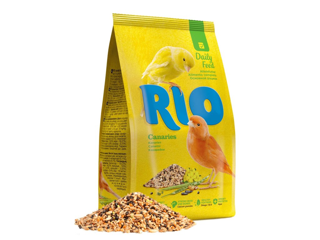 RIO směs pro kanárky 1 kgVyvážené denní krmivo pro kanáry. Obsahuje zdravá semena a zrna, které kanárci milují. Krmivo také obsahuje proso, řepky, nigerské semeno a lněné semínko. Mimo jiné obsahuje také přidaný vápník pro pevnost kostí a zobáků a také řasy pro udržení zdravého imunitního systému.