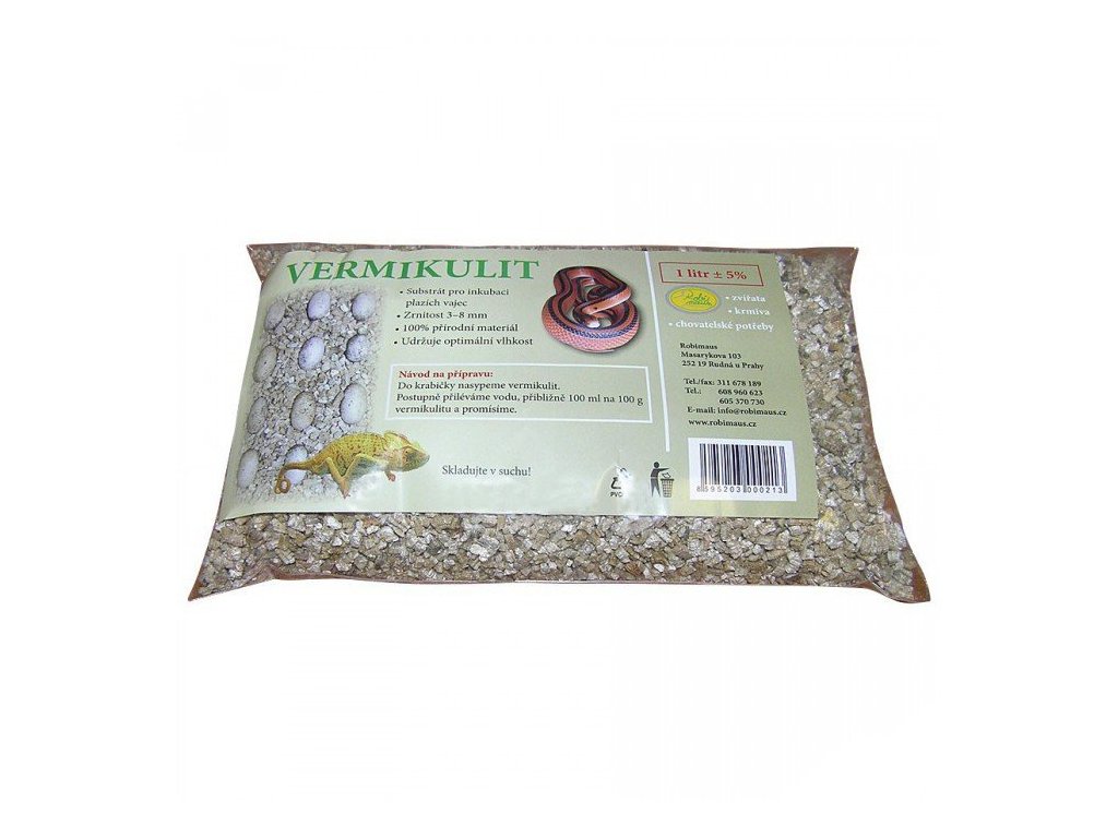 Robimaus Vermikulit 1 lSubstrát vhodný pro líhnutí plazích vajec. Díky výborné porézní struktuře váže mnoho vody a udržuje kolem sebe vlhké prostředí, aniž by ho zamokřil (u mnoha druhů plazů kapky vody na vejcích zabraňují vývoji zárodku). Mimořádné vlastnosti tohoto substrátu z něj dělají ideální prostředí pro vývoj a líhnutí vajec.
