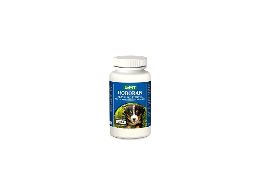 ROBORAN KLASIK pro štěňata podáváme do jednoho roku věku zamíchaný v krmivu (maso s přílohou, BARF).