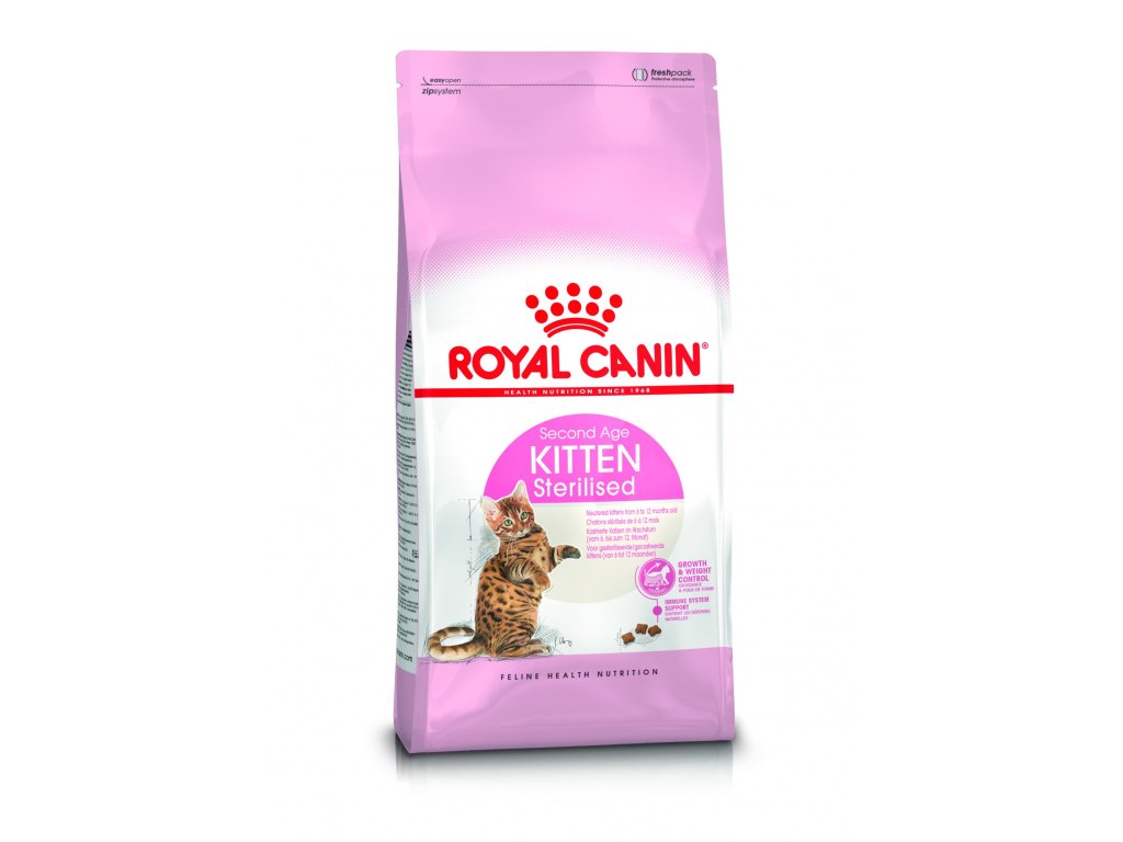 Royal Canin Kitten SterilisedVýborné krmivo pro přerod kotěte v dospělou kočku. Během 6. a 12. měsíce - období nových objevů, potřebuje imunitní systém kotěte podporu, hlavně pokud bylo vykastrováno. V krmivu obsažené živiny mu tuto podporu poskytnou. V chutných a křupavých granulích se nachází drůbeží maso a rostlinná vláknina, které zaručují skvělou chutnost a optimální rovnováhu živin. Poskytuje speciální kombinaci vitaminů, minerálních látek a komplex antioxidantů. A protože kastrovaná koťata většinou přijímají více potravy granule obsahují nižší množství tuku. Díky tomu je snazší udržet kočičímu juniorovi ideální váhu a vhodný obsah bílkovin, vápníku a fosforu pro zdravý růst.