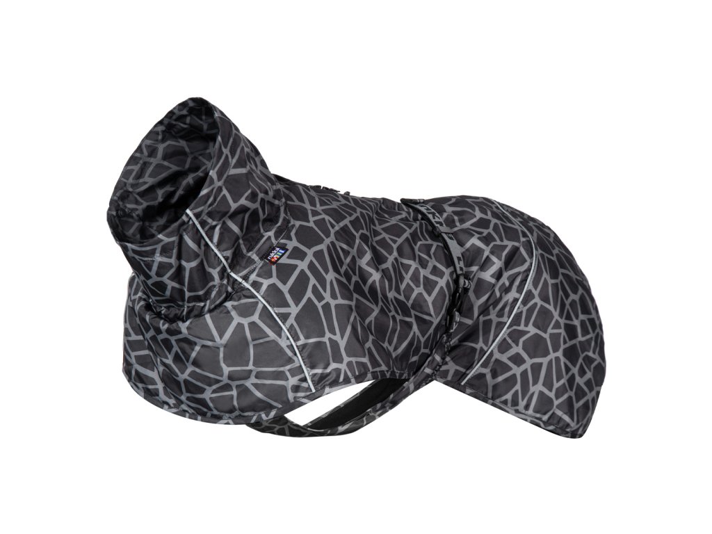 Pláštěnka má na zádech ovor s dvojsměrným zipem s voděodolnou úpravou pro připevnění vodítka k postroji nebo obojku. V spodní části zad nad kořenem ocasu má navíc stahování, díky kterému můžete až o několik centimetrů přizpůsobit délku zad. Díky pružnému pásku s přezkou je oblékání a zapínání rychlejší a snadnější. Vysoký ochranný límec chrání vašeho psa při velkém větru nebo dešti a elastické gumičky v zadní části zase zajistí, že pláštěnka zůstane na svém místě za všech podmínek, a to i při aktivitách s vyšší intenzitou. Pláštěnka je velmi lehká, příjemně měkká, nešustí a je snadná na údržbu, rychle schne.