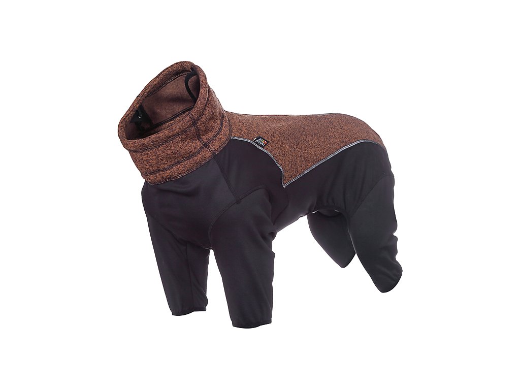 Dobře padnoucí kombinéza, která udržuje psa v teple za chladného počasí, je vyrobená z kombinace technických materiálů, které jsou velmi lehké na nošení a zároveň velmi pružné, aby se plně přizpůsobili pohybu psa. Vysoký límec a záda overalu jsou z technické pleteniny, spodní část kombinézy a nohy z extrémně elastického trikotového úpletu s hladkým povrchem, ze kterého lze snadno setřít špínu a rychle schne. Oba materiály mají na vnitřní straně měkký kartáčovaný vlas, který vytváří izolační vrstvu, jsou prodyšné a zároveň hřejivé.
