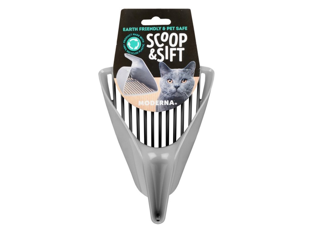 Prosívací lopatka pro snadné čištění kočičích toalet. Je součástí ucelené řady +98% RECYCLED PLASTIC, která sleduje moderní trend výrobků z recyklovaných materiálů.