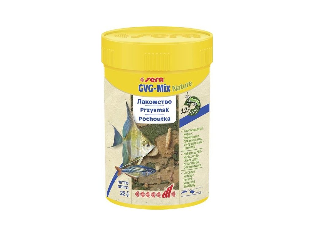 Sera GVG mix Nature 100 mlSměs vloček a celých kousků sušeného krmného hmyzu, jako jsou krunýřovky, červené komáří larvy a hrotnatky. Krmivo je obzvlášť bohaté na přírodní minerální látky a stopové prvky a podporuje zdraví a plodnost. Vločky jsou dlouho tvarově stabilní a nekalí vodu. Produkt patří do řady produktů "Sera Nature", která nevyžaduje žádná barviva ani konzervační látky. Rozmanitá potrava s přísadami blízkými přírodě je nejlepší ochranou před nedostatky a podporuje zdraví a čilost ryb. Krmiva typu Nature obsahují přírodní složky jako spirulina, krill nebo udržitelnou hmyzí moučku z larev mouchy bráněnky.