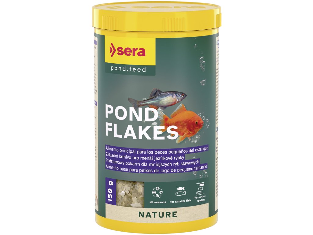 Sera kompletní krmivo pro ryby v jezírku Pond Flakes 1000 ml NATURESera Pond Flakes je základní vločkové krmivo vhodné pro různé druhy ryb v jezírku, především pak pro menší druhy. Vyvážená skladba zcela splňuje požadavky mnoha druhů ryb. Šetrné zpracovaní zajistí, že hodnotné ingredience, např. omega mastné kyseliny, vitaminy a minerální látky jsou zachovány. Sera výrobní proces umožňuje vytvořit tenké, snadno stravitelné vločky, které si drží svůj tvar a tím není voda znečišťována. Díky skladbě krmiva lze krmit celoročně. Pro zvýraznění barev doporučujeme střídavě krmit Sera Koi Professional Spirulina Color Food for Koi a Sera Goldy Color Spirulina pro zlaté rybky nebo ostatní menší druhy.