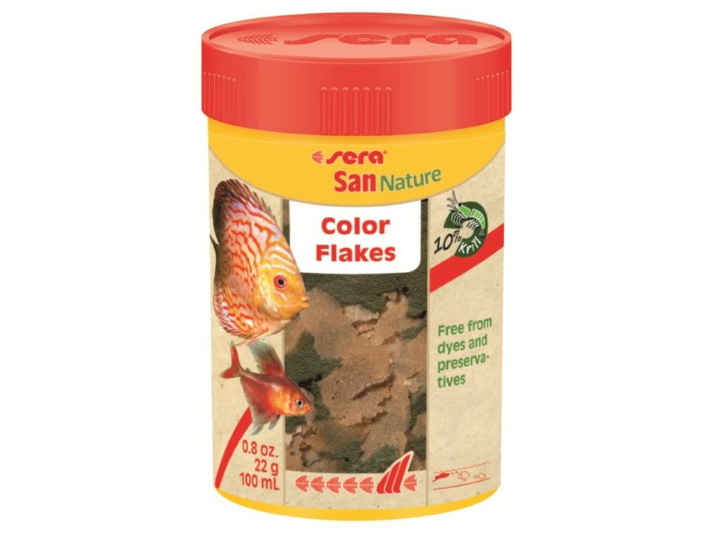 Sera – San NATURE 100 mlZbarvení je dosaženo výhradně přírodními složkami jako řasou Haematococcus bohatou na staxantin a kril. Současně je u okrasných ryb umocněna přijatelnost, živost a připravenost se rozmnožovat. Vločky drží tvar, jsou vhodné pro všechny okrasné ryby, které hledají potravu na hladině, a nekalí vodu.