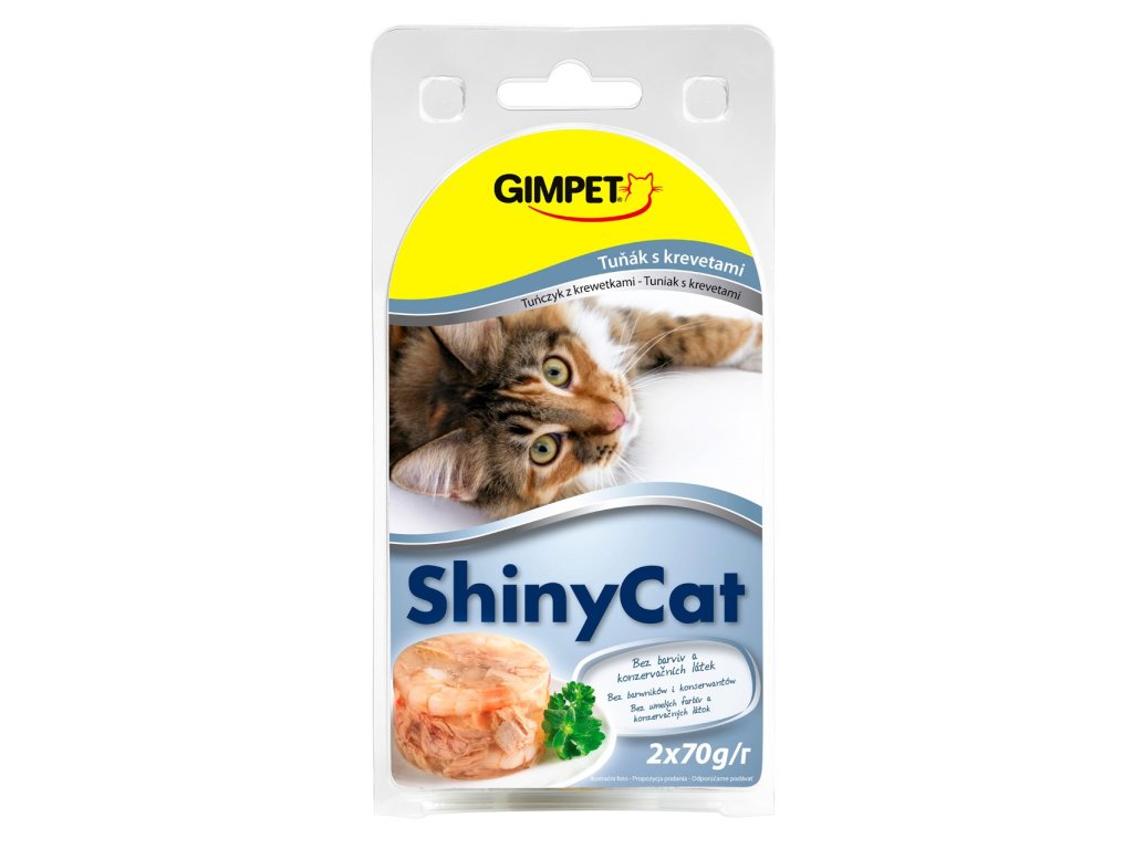 ShinyCat konzerva tuňák + krevetyLahůdkové, čistě masové konzervy – pouze přírodní směs krevet a tuňáka. V konzervě je vidět na jemno nakrájené tuňákové maso a krevety. Tato strava je bez obsahu umělých přísad a konzervačních látek.