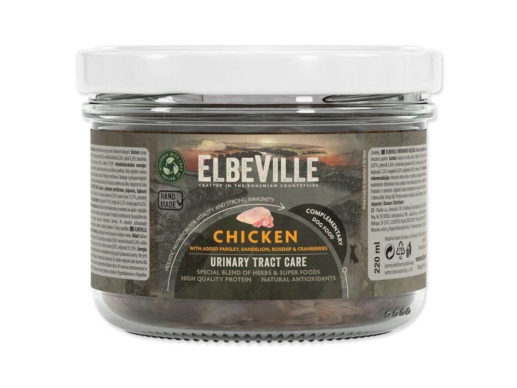 Sklenice Elbeville Dog Urinary Tract Care, kuřecí s přidanou petrželí, pampeliškou, 220ml