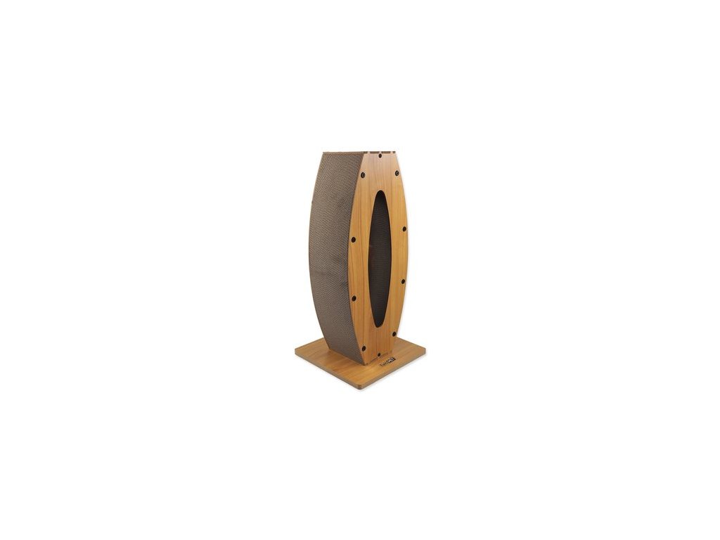 Designové škrabadlo pro kočky s dřevěnou konstrukcí a možností výměny kartonových částí.