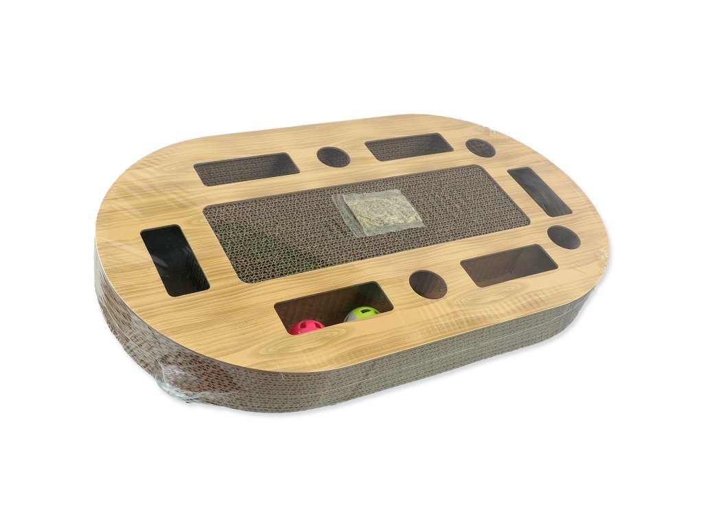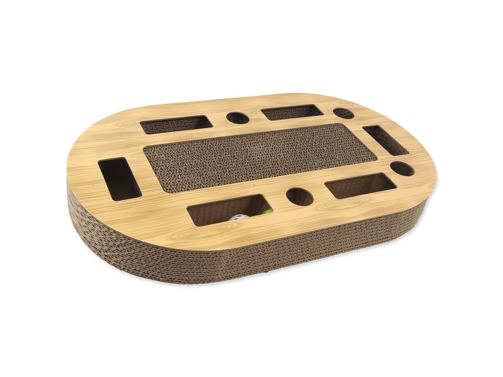 Interaktivní kartonové škrabadlo pro kočky se šantou, barevné provedení ve vzoru dub.