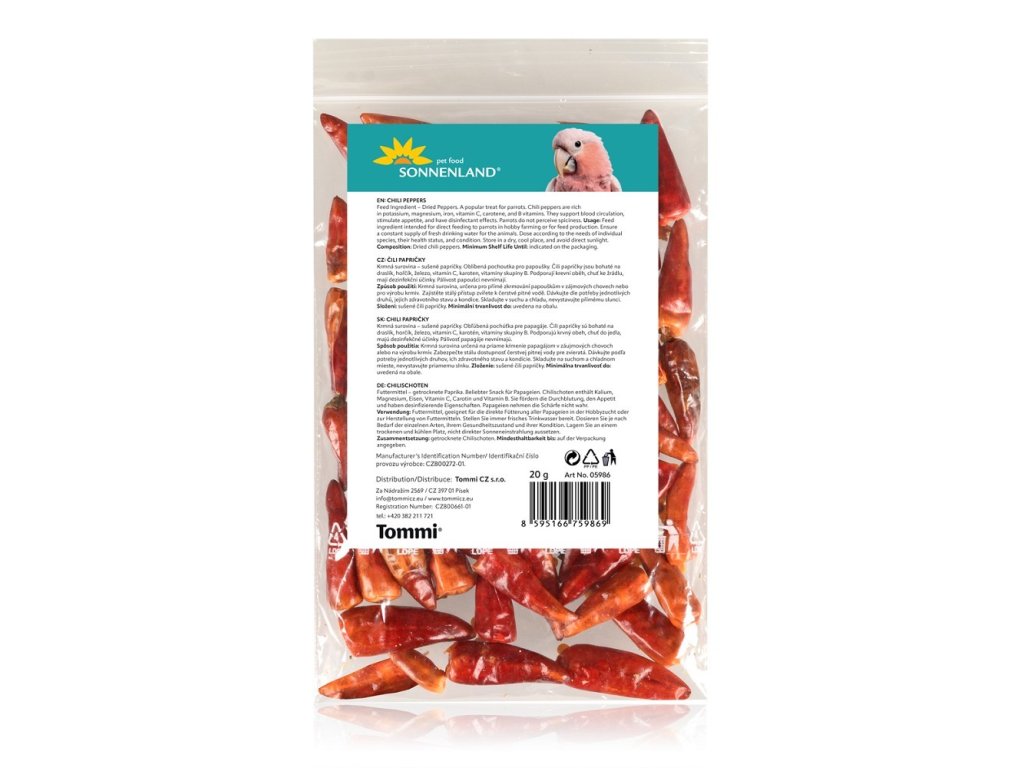 Zdravý přírodní doplněk stravy pro podporu vitality a imunity papoušků. Čili papričky jsou bohatým zdrojem vitamínu C a karotenů, navíc obsahují cenné minerály jako draslík, hořčík a železo a také vitamíny skupiny B.