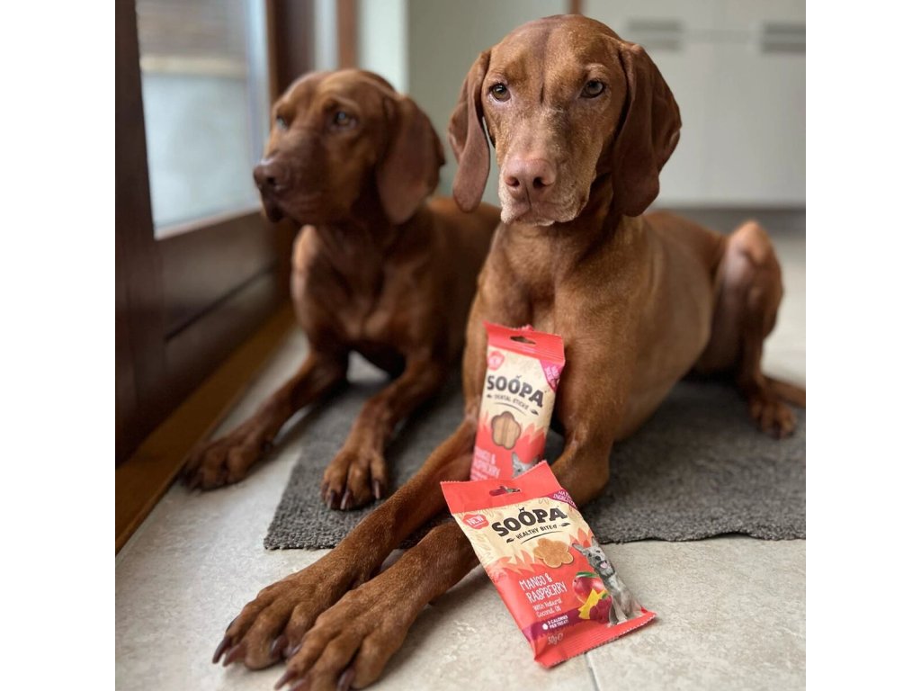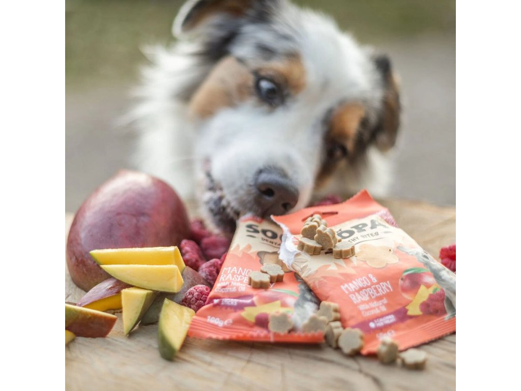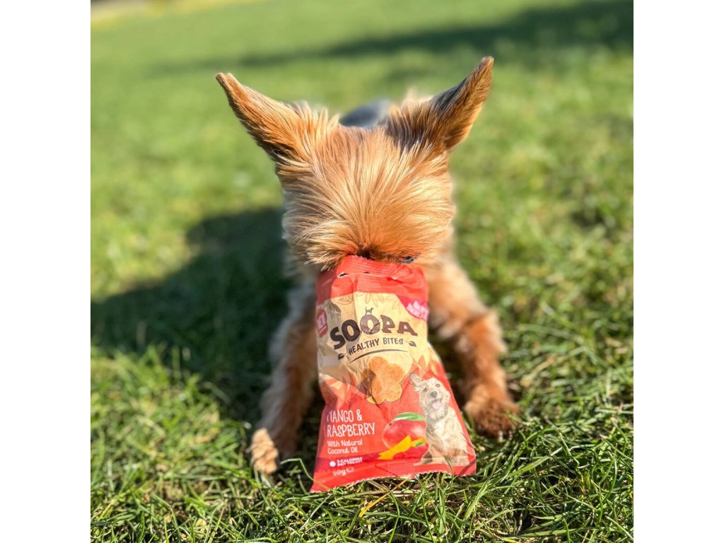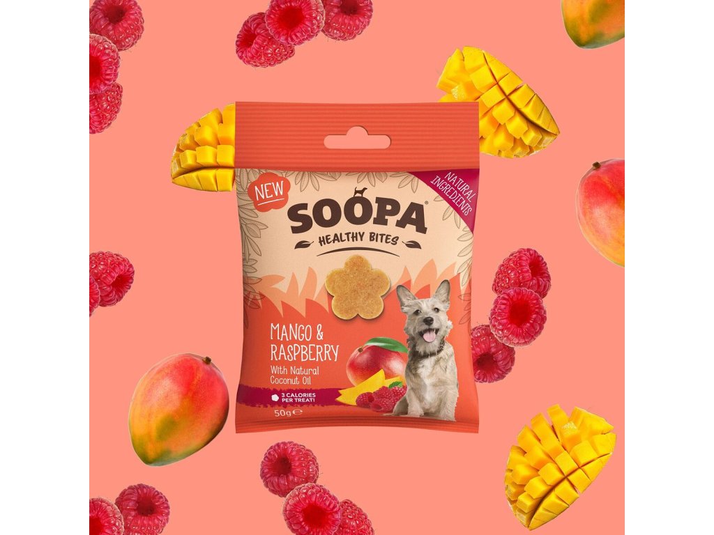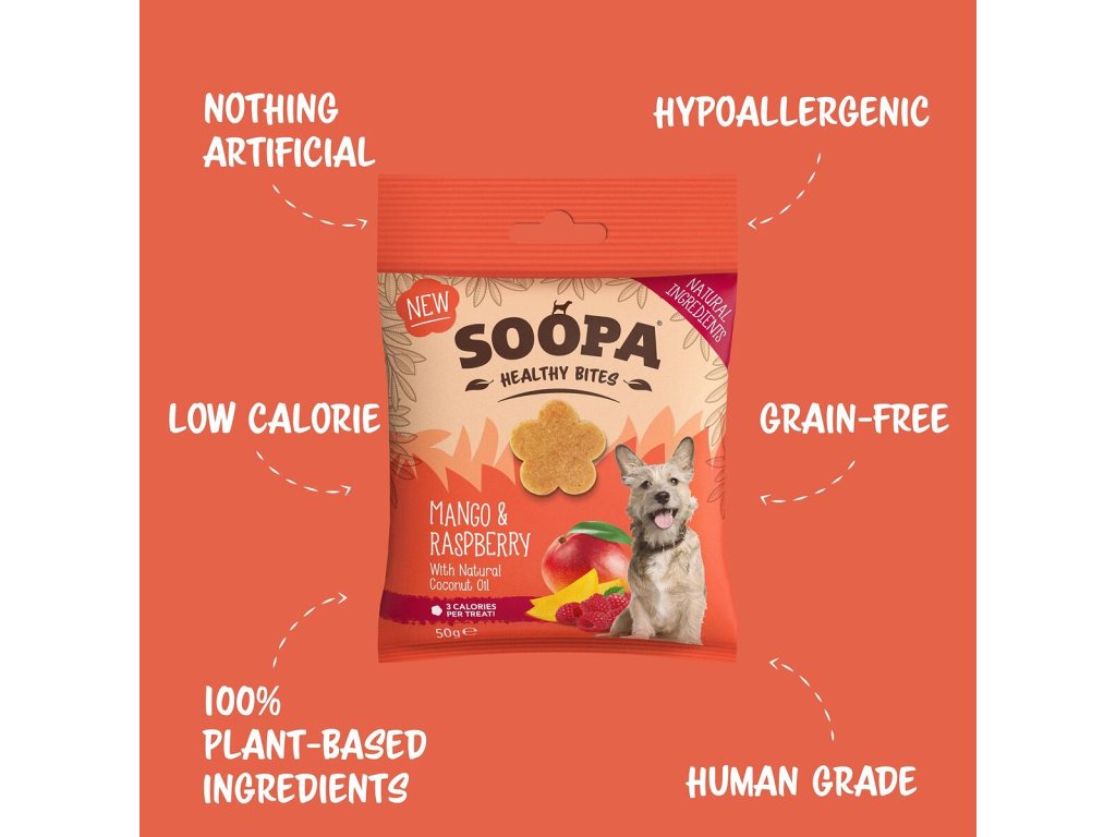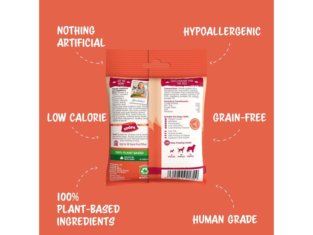 Soopa Bites jsou 100% přírodní pamlsky pro psy s čistě veganským složením. Díky své měkčí konzistenci, malým rozměrům, vyváženému složení a lahodné chuti skvěle poslouží jako odměny při tréninku i jako pamlsky kdykoliv během dne, když chcete svému chlupatému parťákovi dopřát něco chutného a zároveň zdravého. Neobsahují obiloviny, umělá barviva ani dochucovadla. Jsou přirozeně nízkotučné, hypoalergenní a snadno stravitelné – skvěle se hodí i pro psy s alergií na živočišné bílkoviny, citlivým zažíváním nebo s nízkoproteinovou dietou. veganské složení bez obilovin, dochucovadel a umělých barviv s mangem, malinami a kokosovým olejem snadno stravitelné, vhodné i pro psy s citlivým zažíváním nízkotučné a s nízkým obsahem proteinu jsou vyrobeny pouze ze 100% přírodních surovin a koncipovány tak, aby svými nutričními hodnotami prospívali celkovému zdraví psa Mango je plné vitamínů A, B6 a C, které podporují imunitu, napomáhají správnému trávení a přispívají k lesklé srsti. Jeho sladkokyselá chuť a vůně dodávají pamlskům tropický nádech, bez nutnosti přidání jakýchkoliv umělých dochucovadel. Maliny jsou bohatým zdrojem vlákniny, vitamínu C a antioxidantů, které přispívají k celkové vitalitě a zároveň podporují správné trávení. Kokos je bohatý na MCT tuky, které mimo jiné podporují správnou funkci mozku. Jde o snadno vstřebatelný zdroj energie, vhodný i pro psy s nadváhou. Kromě toho má protizánětlivé účinky a pozitivně ovlivňuje zdraví srsti, kůže a drápků. Složení: bramborová moučka (z celých brambor), rostlinný glycerin (ne palmového původu), tapiokový škrob, cizrnová moučka, celulózová vláknina, kvasnicové produkty, organický kokosový olej 2,5 %, maliny 2 % (prášek), mango 1 % (prášek) Analytické hodnoty ve 100 g výrobku: hrubé bílkoviny 5,15 %, hrubá vláknina 1,1 %, hrubé oleje a tuky 6,14 %, hrubé popeloviny 1,59 %, vlhkost 12 % Doporučené dávkování: malí psi (do 10 kg) 5 kousků za den, střední psi (10-20 kg) 10 kousků za den, velcí psi (nad 20 kg) 15 kousků za den Množství podávaného pamlsku vždy přizpůsobte hmotnosti, aktivitě a celkové kondici psa. Zajistěte dostatek pitné vody. Pravidelné podávání pamlsku výrazně ovlivňuje výše uvedené účinky obsažených látek.Doplňkové parametry