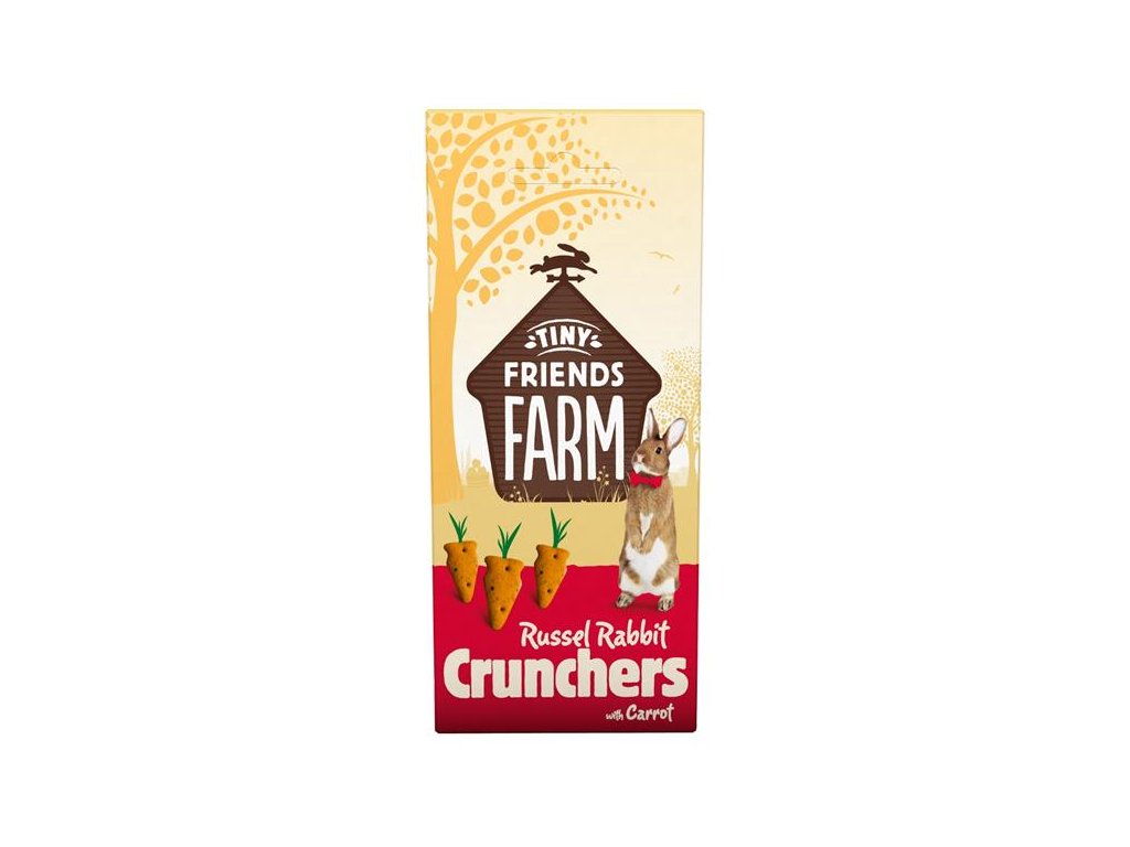 Supreme Tiny FARM Russel Rabit Crunchers s mrkví jsou výborné sušenky vhodné pro všechny králíky, morčata, křečky, činčily, pískomily, myši a potkany.
