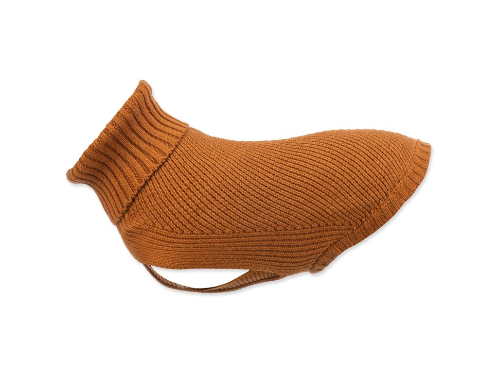 Zajímavým prvkem je široký rolák kolem krku, který dodává svetru moderní a elegantní vzhled. Svetr je navíc vybaven praktickými poutky na zadní nohy, což zajišťuje, že svetr bude na těle psa perfektně sedět.