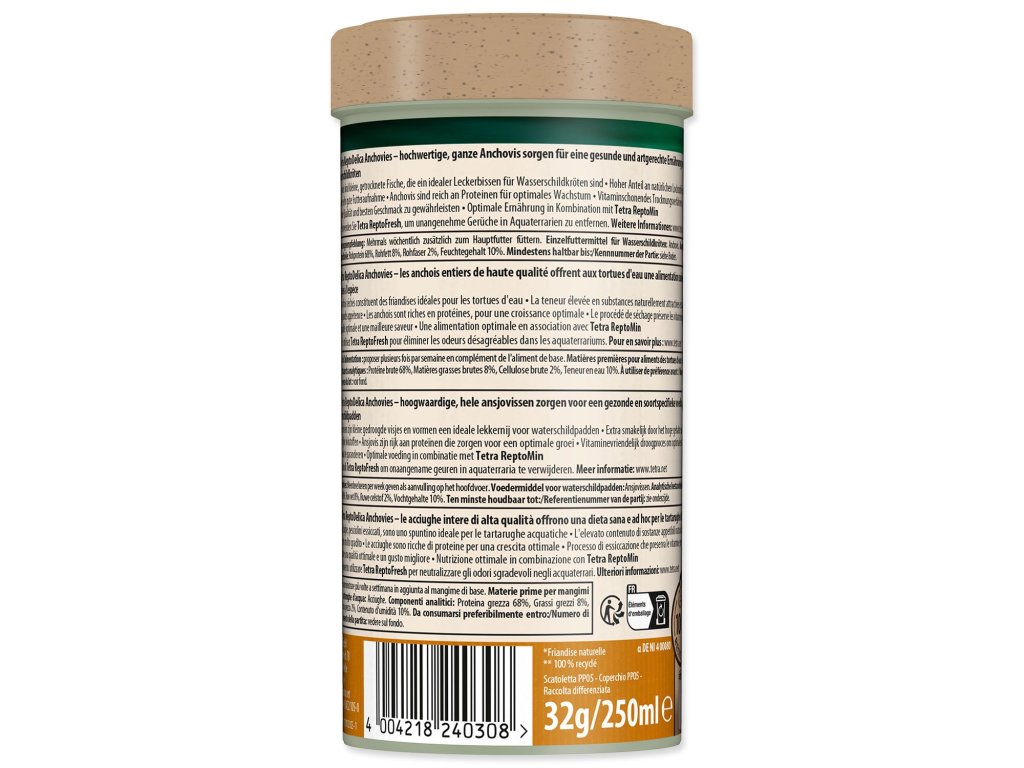 Krmivo pro vodní želvy se skládá z celých ančoviček pro přirozenou výživu. Ančovičky jsou malé, sušené ryby, které jsou ideální dárek pro vodní želvy. Jsou mimořádně bohatým zdrojem bílkovin pro zdravý růst svalů a tělesný růst. Proces jemného sušení zajistí nejlepší kvalitu a nejlepší chuť. Bohaté na přírodní atraktanty.