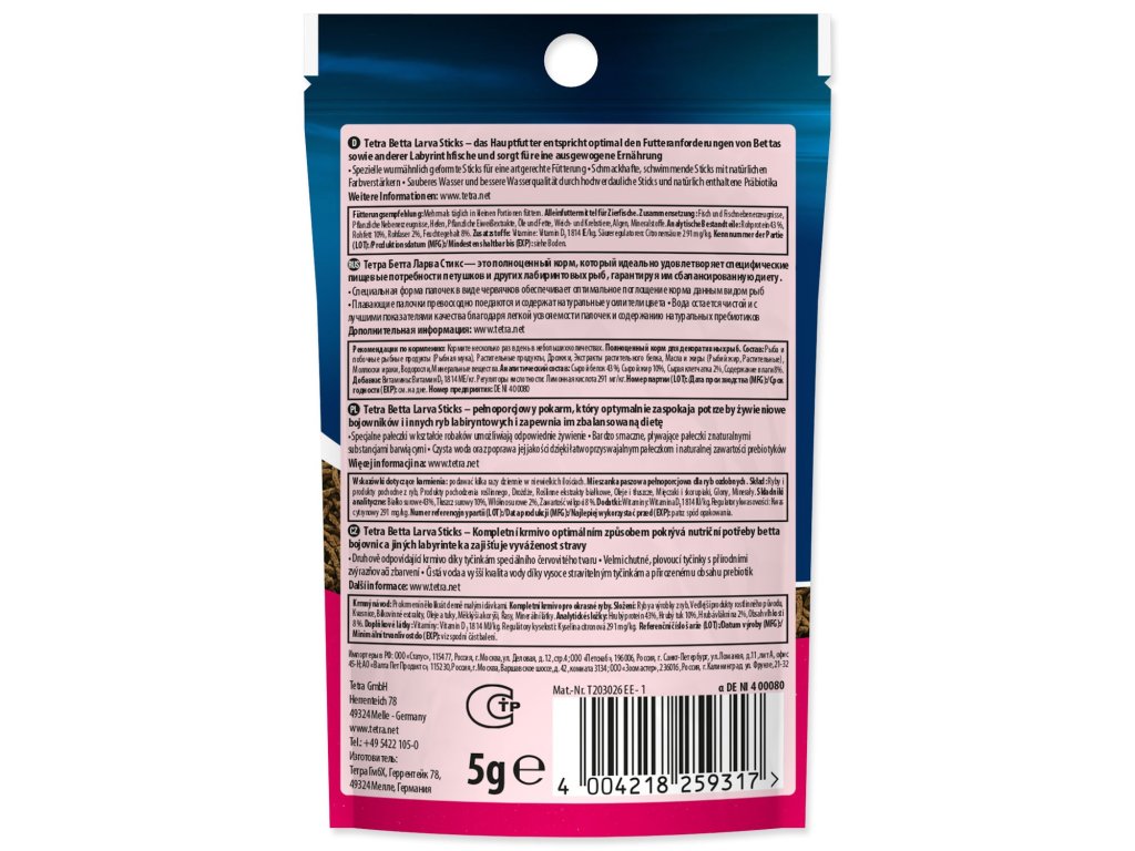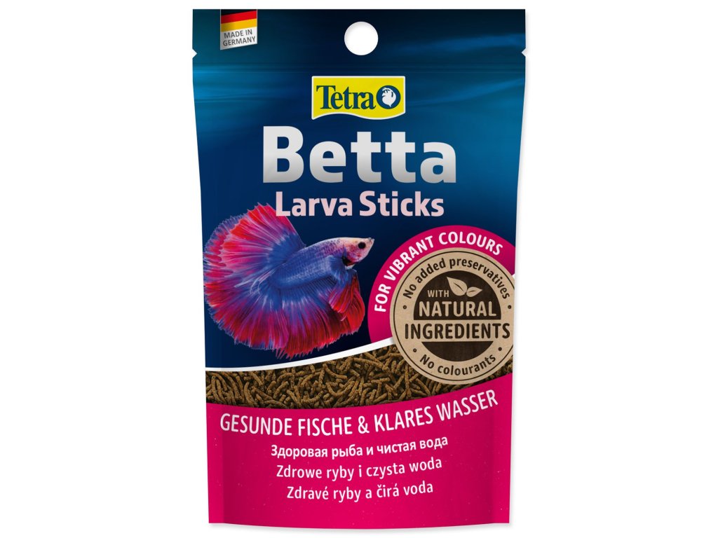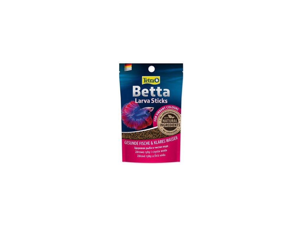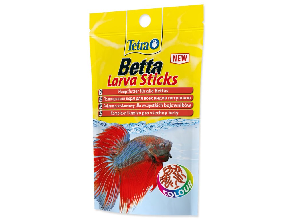 Nové krmivo Tetra Betta Larva Sticks nabízí druhově odpovídající krmivo, které ideálním způsobem pokrývá nutriční potřeby tropických ryb rodu betta a jiných labyrintek. Toto speciální krmivo připomíná svou velikostí, tvarem a barvou komáří larvy, jednu z nejoblíbenějších rybích pochoutek. Toto nové speciální krmivo je ideální k vytvoření přirozených podmínek rybám v akváriu: krmivo plave na hladině vody. Osahuje velice chutné krevetky a vysoký obsah karotenoidů, čímž posiluje zářivé zbarvení ryb. Vysoce kvalitní bílkoviny a omega-3 mastné kyseliny poskytují dostatečnou energii pro zajištění zdravého růstu. BioActive formule pomáhá udržovat rybám zdravý imunitní systém a zvyšuje jejich odolnost, energii a vitalitu.