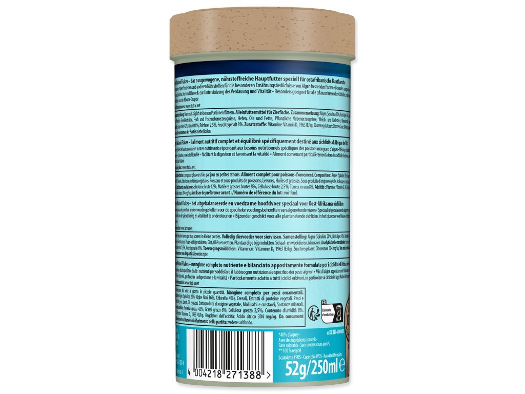 Speciální vyvážené vločkové krmivo pro východoafrické cichlidy. Obohaceno o kvalitní proteiny a další živiny.