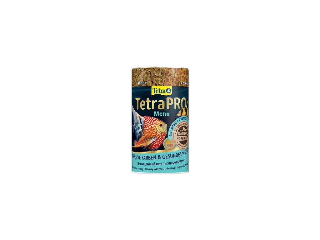 Tetea Pro Menu s vysokým obsahem živin obsahuje 4 druhy lupínků s různým složením v samostatných přihrádkách pro rozmanitost stravy ryb.