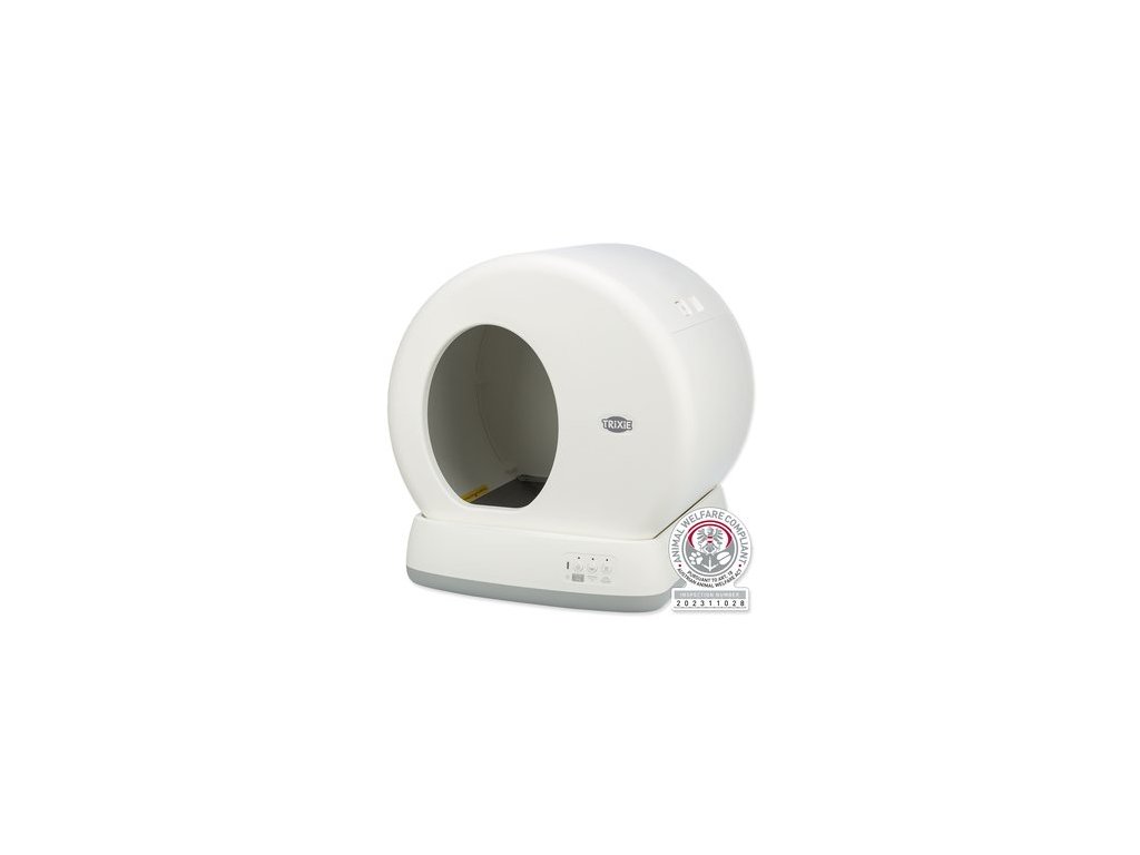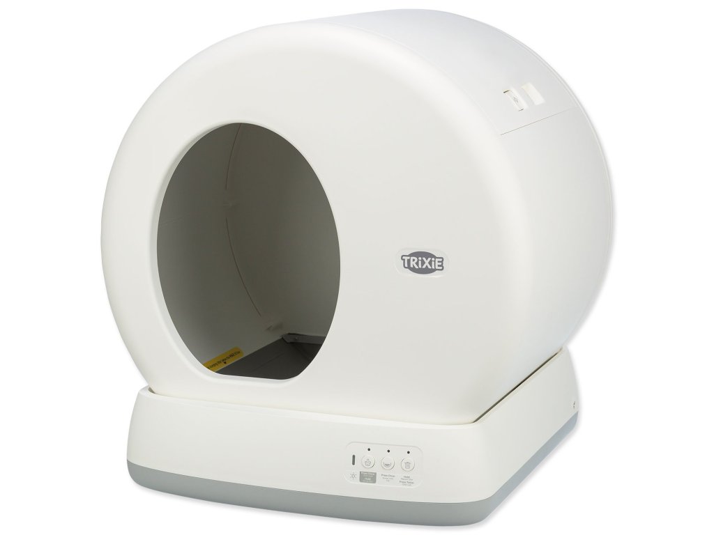 Automatická toaleta Trixie v bílé barvě, vybavena systémem, který po každém použití otáčí buben a odděluje nečistoty od čistého steliva. Díky tomu je toaleta neustále čistá a připravená pro další použití.