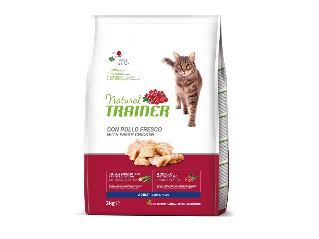 Trainer Natural Cat Adult kuřecí 3 kgKrmivo pro dospělé kočky, které mají rády chuť drůbežího masa. Snadno stravitelné granule s obsahem kvalitního kuřecího masa ideální pro každou kočku. Krmivo má nejen výbornou chuť, ale zároveň dodá vašemu mazlíčkovi všechny potřebné živiny, vitaminy a minerální látky.