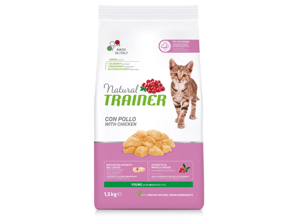 Natural Trainer Cat Young kuřecí 1,5 kgKrmivo pro mladé kočky (7-12 měsíců), která mají rády chuť kuřecího masa. Snadno stravitelné granule s obsahem kvalitního kuřecího masa ideální pro každou kočku. Krmivo má nejen výbornou chuť, ale zároveň dodá vašemu mazlíčkovi všechny potřebné živiny, vitaminy a minerály, které potřebuje ke správnému vývoji a zdravému růstu. S přídavkem kvasnic pro podporu imunity a brusinek pro správnou funkci močového ústrojí. Lahodné krmivo, kterému neodolá ani ta nejmlsnější kočička. Bez barviv, konzervantů a přidaných cukrů.