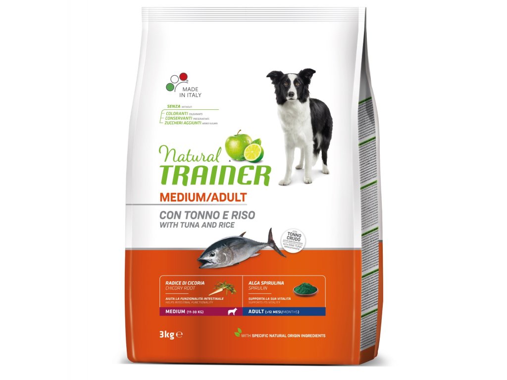 TRAINER Natural Medium Adult Ryba a rýže 3 kgPokud váš pes miluje rybí maso, pak jsou tyto granule těmi pravými pro něj. Určeny jsou dospělým psům středních plemen, čemuž odpovídá i velikost granulí. Jsou vyrobeny z čerstvého masa a obsahují také čekanku a algu spirulinu. Mají vynikající chuť a zároveň podporují zdravé trávení, energii a udržují psa v optimální hmotnosti. S extraktem z jablka, který napomáhá k ústní hygieně. Granule mají velikost odpovídající konzumování středně velkými psy.
