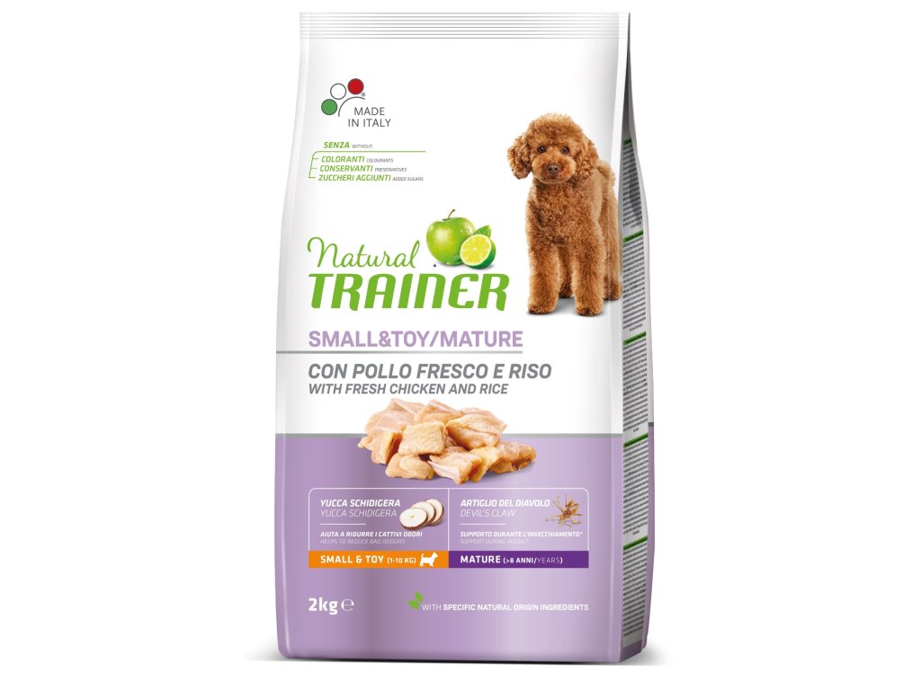 Natural Trainer Small&Toy Maturity Čerstvé kuře 2 kgKrmivo speciálně navržené pro staré psy malých plemen (1-10 kg). Starší psi nad osm let mají specifické nároky na výživu, protože už obvykle nemají tolik pohybu a zároveň potřebují podpořit imunitu a bojovat proti stárnutí organismu. Krmivo Trainer Natural má lahodnou chuť čerstvého kuřete, které neodolá ani ten nejmlsnější psí jazýček, a zároveň dodá vašemu stárnoucímu mazlíčkovi vše, co potřebuje pro spokojený podzim života. Obsahuje ďáblův dráp, který pomáhá zpomalovat stárnutí a juku pro redukci zápachu exkrementů. Bez barviv, konzervantů a přidaných cukrů.