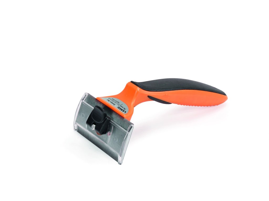 Profesionální trimovací hřeben pro psy a kočky. Odstraňuje línání a uvolněné chlupy v husté, "drátěné" nebo jemné srsti vašeho mazlíčka díky čepeli z nerezové oceli s dvojitým ozubením a pohodlnému rotačnímu systému. Ideální pomocník pro péči o psy a kočky. Ergonomická rukojeť s měkkým úchopem zajišťuje bezpečnost v ruce a usnadňuje práci. Odstraňuje uvolněnou srst a přebytečnou podsadu lépe než jakýkoli kartáč, hrábě nebo hřeben. Zabraňuje línání a udržuje váš dům čistší a zdravější, zejména pro alergické členy rodiny.Upozornění: Nepoužívejte nadměrně na stejné ploše a nepoužívejte příliš velký tlak. Nepoužívejte, pokud je srst vašeho mazlíčka silně zmatněná a zacuchaná.