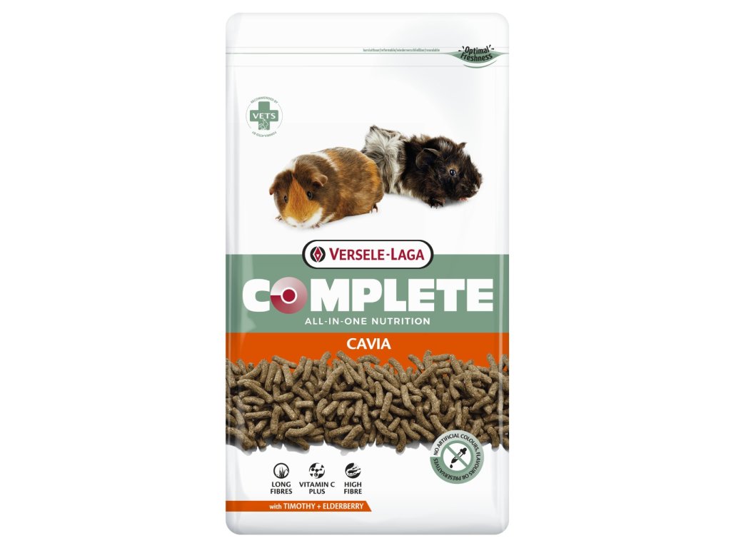 Versele-Laga Cavia Complete krmivo pro morčataCavia Complete je lahodné kompletní krmivo ve formě extrudátu. Každý kousek obsahuje stejně vyváženou směs složek, která je optimálně přizpůsobena nutriční fyziologii morčat. Tímto je zamezeno vybíráním pouze jednotlivých částí krmiva. Při výrobě je vyloučeno přidání obilných zrn. Lehce stravitelné krmivo je složeno ze 20 % vlákniny. Ta, stejně jako přidaná prebiotika (FOS a MOS), napomáhají zdravé střevní flóře. Extrudáty obsahují dlouhá vlákna, která jsou optimální pro obrušování stále rostoucích zubů.