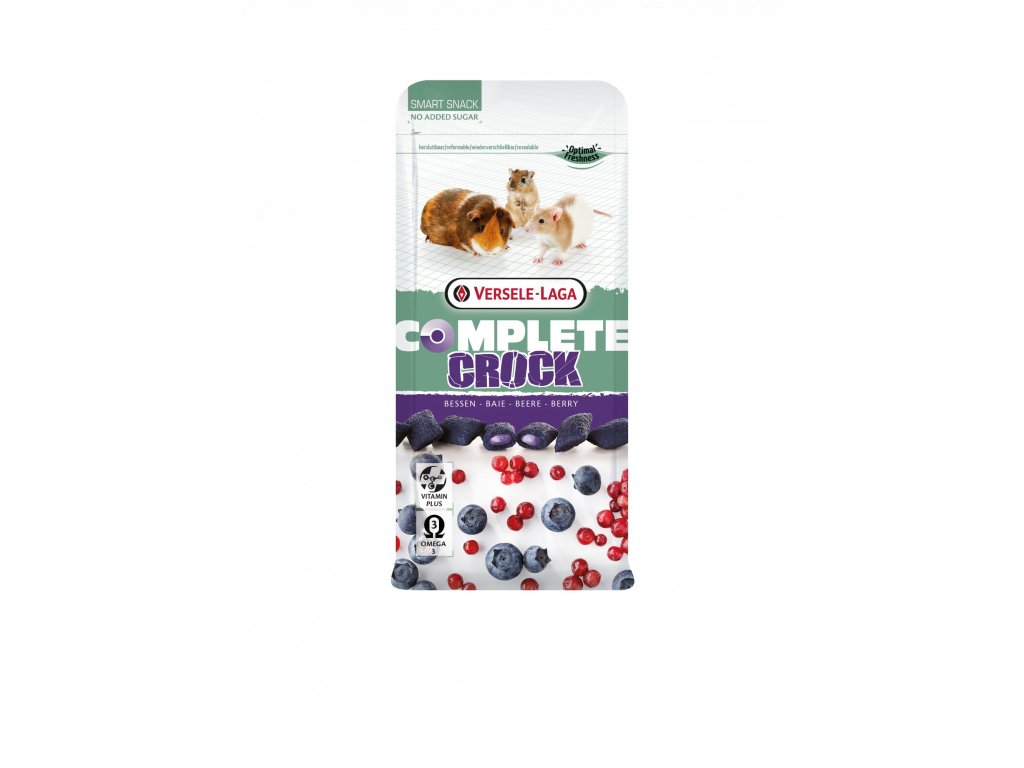 Versele-Laga Crock Complete Berry - s borůvkami a ostružinami 50 gLahodné polštářky s náplní z borůvek a ostružin jsou skvělou pochoutkou pro králíky a hlodavce. Jedná se o doplňkové krmivo, které je bez přidaného cukru a obsahuje omega-3 mastné kyseliny. Šťavnaté křupavé kousky zaručují skvělou chuť, příjemnou vůni a požitek z kousání.