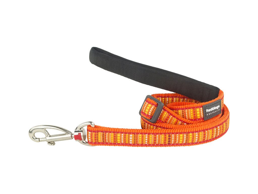 Klasické vodítko Red Dingo pro psy. Délku je možné jednoduše nastavovat pomocí jezdce v rozmezí 1,0 – 1,8 m. Šířka popruhu 15 mm. Vodítka mají v oblasti držení velice jemný polstrovaný nylon, který zaručuje maximální pohodlí i pro majitele temperamentnějších psů. Vodítka Red Dingo jsou vyrobené z kvalitního nylonového popruhu. Okraje jsou hustě tkané pro ještě větší odolnost vůči oděru. Našitá stuha se vzorem je utkaná speciální technikou, která zaručuje vysokou odolnost a trvanlivost. Použitá příze zajišťuje skutečnou stálost barev. Karabiny Red Dingo patří mezi jedny z nejpevnějších na trhu a díky unikátnímu výměnnému systému je možné karabinu snadno vyměnit. Vodítko je standardně vybaveno klasickou karabinou Red Dingo. Ostatní karabiny ve tvaru psa je možné dokoupit samostatně. Více najdete v kategorii Karabiny. Zakončení popruhu je pod úhlem 20 stupňů tak, že jsou všechny spoje velice hladké.Doplňkové parametry