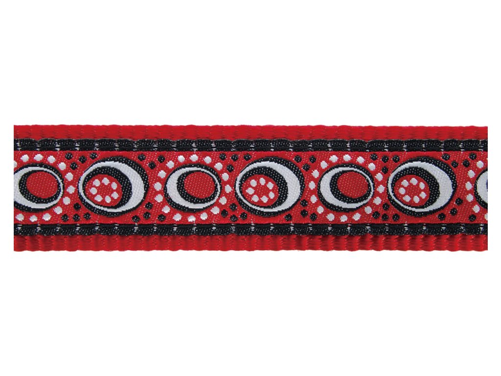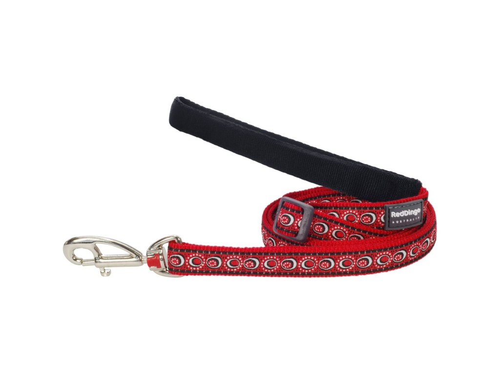 Klasické vodítko Red Dingo pro psy. Délku je možné jednoduše nastavovat pomocí jezdce v rozmezí 1,0 – 1,8 m. Šířka popruhu 25 mm. Vodítka mají v oblasti držení velice jemný polstrovaný nylon, který zaručuje maximální pohodlí i pro majitele temperamentnějších psů. Vodítka Red Dingo jsou vyrobené z kvalitního nylonového popruhu. Okraje jsou hustě tkané pro ještě větší odolnost vůči oděru. Našitá stuha se vzorem je utkaná speciální technikou, která zaručuje vysokou odolnost a trvanlivost. Použitá příze zajišťuje skutečnou stálost barev. Karabiny Red Dingo patří mezi jedny z nejpevnějších na trhu a díky unikátnímu výměnnému systému je možné karabinu snadno vyměnit. Vodítko je standardně vybaveno klasickou karabinou Red Dingo. Ostatní karabiny ve tvaru psa je možné dokoupit samostatně. Více najdete v kategorii Karabiny. Zakončení popruhu je pod úhlem 20 stupňů tak, že jsou všechny spoje velice hladké.Doplňkové parametry