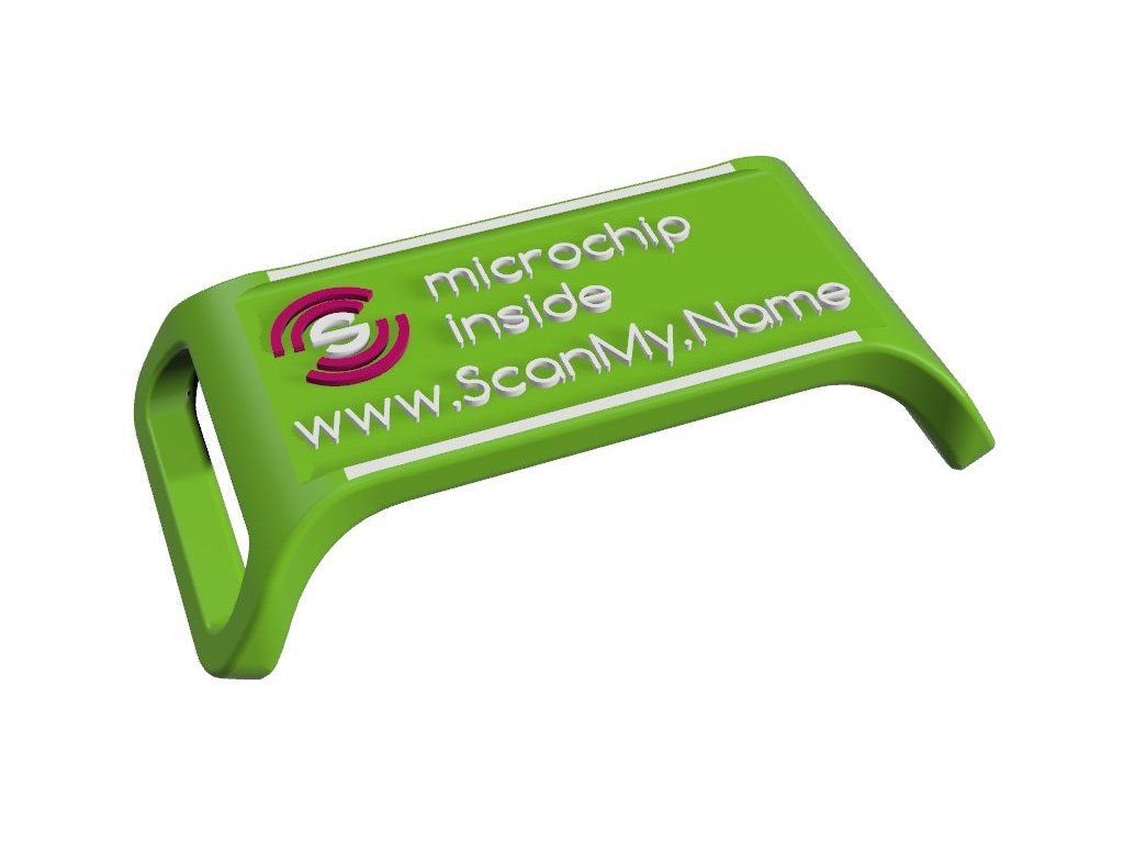 ScanMy.Name chytrá psí známka s čipem - ZelenáNaskenuj mé jméno!Název identifikační známky jasně vybízí k akci! ScanMy.Name. Tedy Naskenuj mé jméno. Identifikace nalezeného zvířete už nemůže být snadnější a rychlejší!