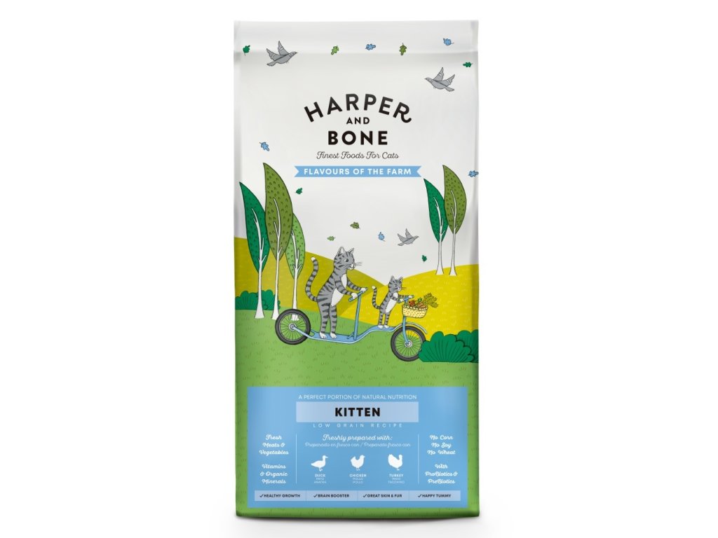 Harper and Bone Cat Kitten příchutě farmy složené pouze z nejkvalitnějších surovin s vysokým podílem masa, přídavkem superpotravin a čerstvé zeleniny, zaručující prospěšné živiny a přirozenou chuť pro dokonale vyváženou výživu.