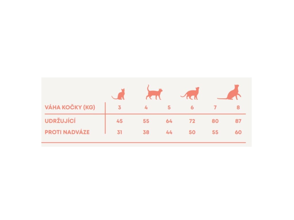 Krmný návod: změnu krmiva je třeba provádět postupně po dobu 7 dní. Jako návod použijte tabulku s dávkováním. Denní množství potravy se může pro každou kočku lišit, záleží na úrovni její aktivity, plemeni a podmínkách prostředí. Denní krmnou dávku podávejte rozdělenou na 2 porce denně, nepoužívejte zbytky krmiva z předchozího dne. Kočka musí mít vždy přístup k čisté, čerstvé vodě. Skladování: skladujte na chladném a suchém místě. Obal by měl být po použití vždy bezpečně uzavřen.
