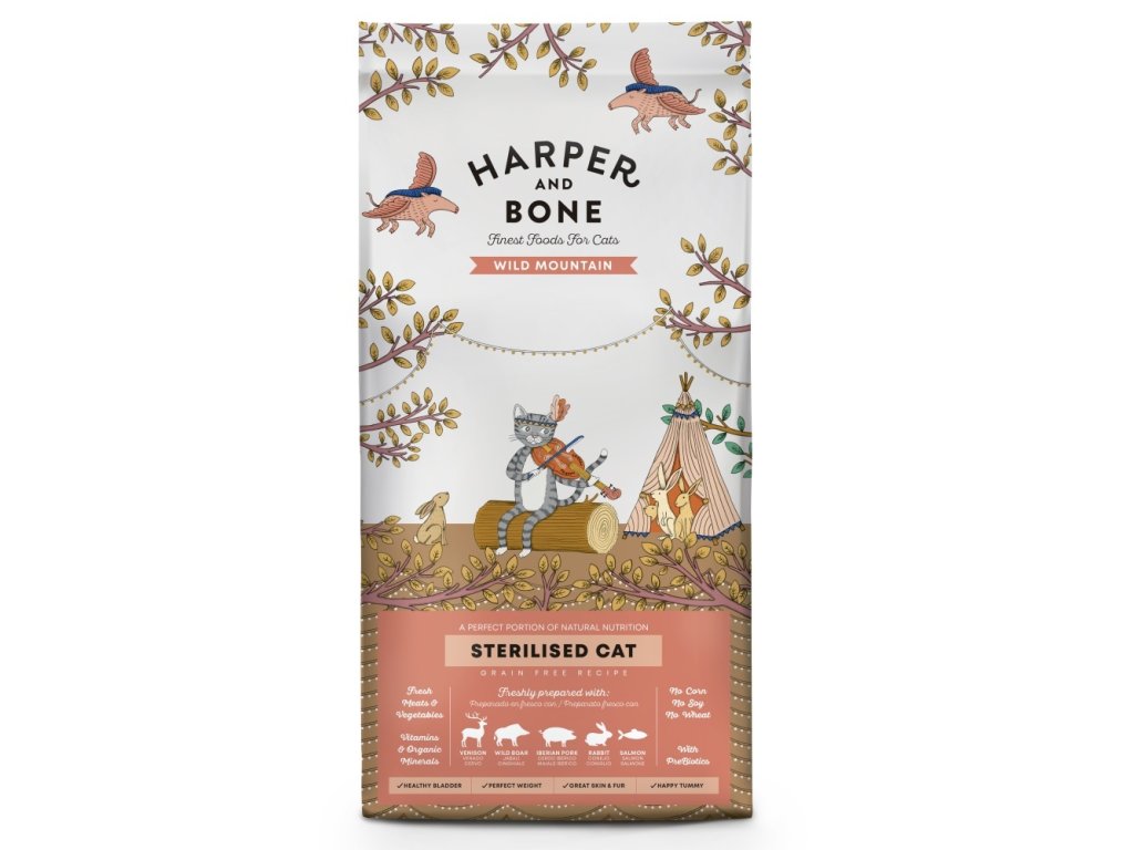 Harper and Bone Cat Sterilised divoké hory složené pouze z nejkvalitnějších surovin s vysokým podílem masa, přídavkem superpotravin a čerstvé zeleniny, zaručující prospěšné živiny a přirozenou chuť pro dokonale vyváženou výživu.