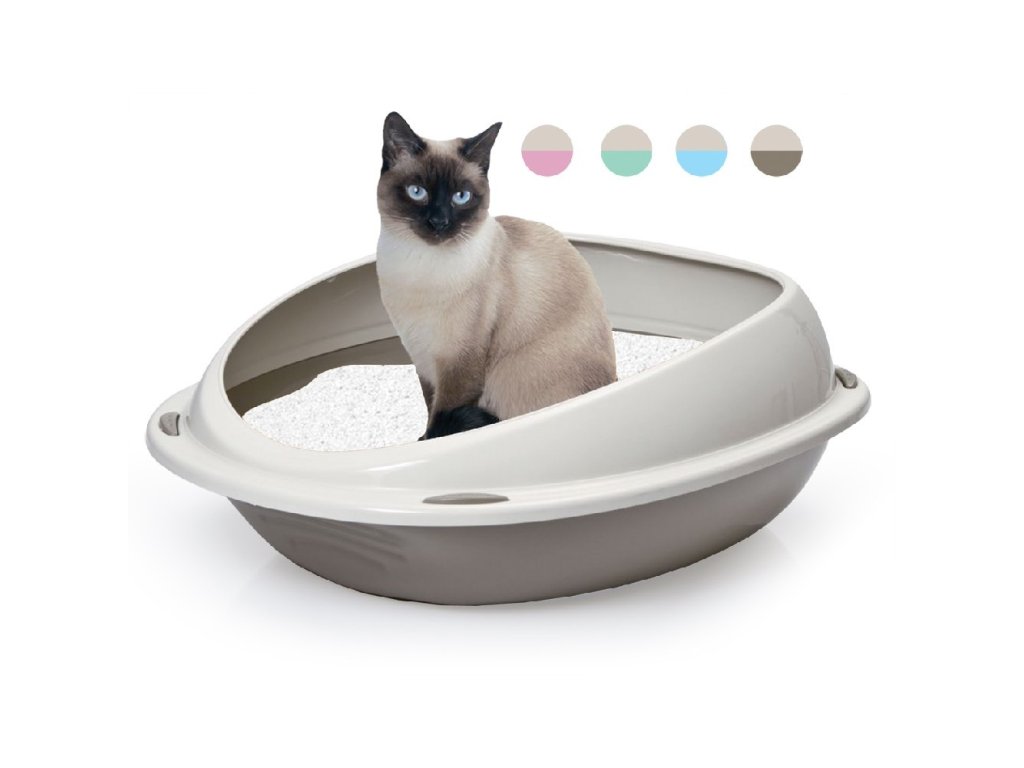 Otevřená toaleta pro kočky s vysokým okrajem.