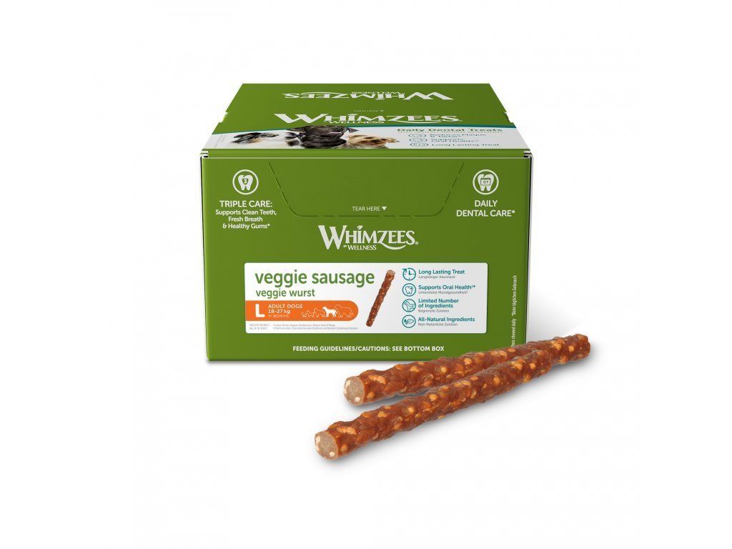 WHIMZEES Veggie párek dentální pamlsek pro psyPárek na čištění zubů není žertem, ale opravdovým pomocníkem pro udržení zářivého a zdravého chrupu. WHIMZEES má jedinečné přírodní a funkční přísady pro zdravou dentální hygienu. Výrobek neobsahuje žádné umělé přísady, barviva, příchutě, konzervační látky, GMO, lepek nebo maso. Mají vysoký obsah vlákniny a nízký obsah kalorií a cukrů, tak s chutí do čištění zubů.
