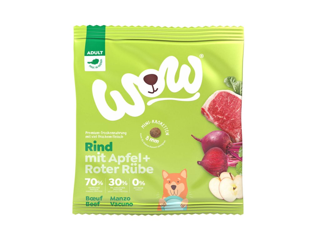 WOW Dog granule Hovězí Adult jsou kompletní přírodní suché krmivo pro dospělé psy s vysokým obsahem kvalitních bílkovin z hovězího masa, špenátem a další zeleninou, obohacené o vitamíny a stopové prvky, za studena lisované oleje a další zdraví prospěšné přísady.