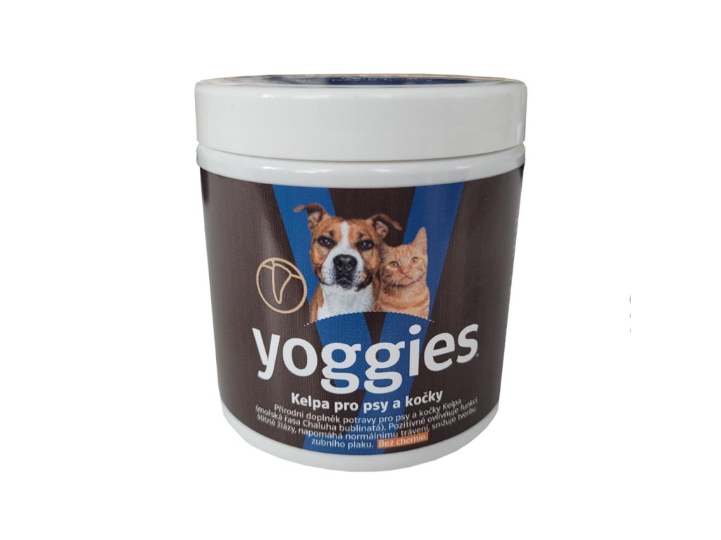 Yoggies® – Kelpa přírodní doplněk potravy pro psy a kočky je bohatá na jód, minerály a vitamíny skupiny B, má také bohatý zdroj elektrolytů. Pozitivně ovlivňuje funkci štítné žlázy a to díky obsahu jódu, který podporuje tvorbu hormonů štítné žlázy. Napomáhá normálnímu trávení, vhodná při redukčních dietách, navyšuje pocit sytosti. Má vliv na snížení tvorby zubního plaku, kamene a zápachu z tlamy - pro docílení nejlepšího efektu doporučujeme kombinovat s mechanickým čistěním zubů.