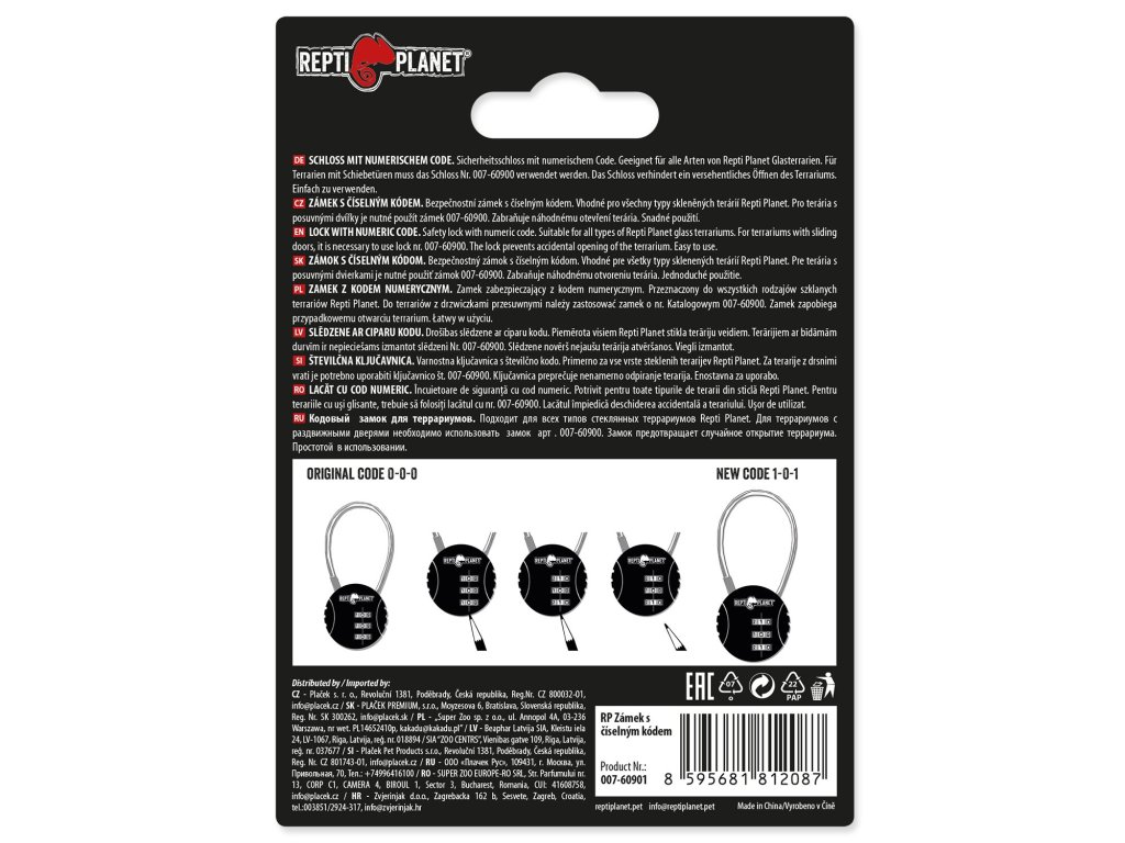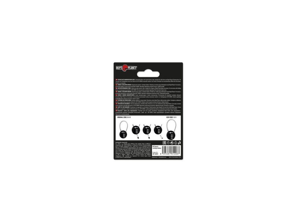 Bezpečnostní zámek s číselným kódem. Vhodné pro všechny typy skleněných terárií Repti Planet. Pro terária s posuvnými dvířky je nutné použít zámek 007-60900. Zabraňuje náhodnému otevření terária. Snadné použití.