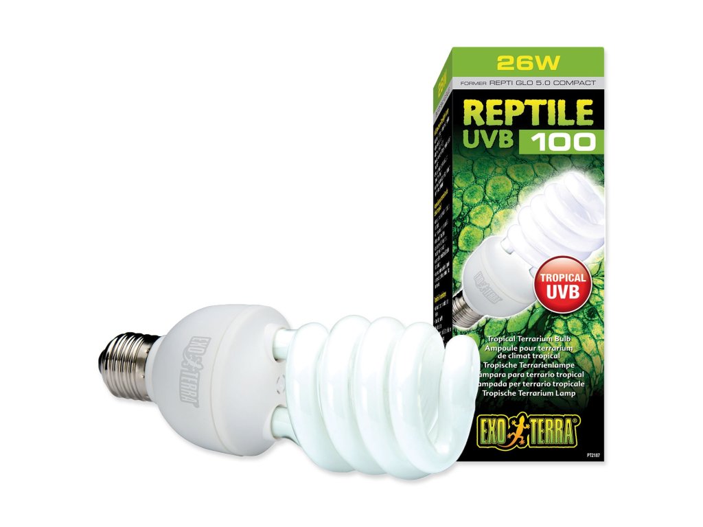 Žárovka Exo Terra Reptile UVB100 vydává optimální úrovně UVB, podobně jako ve stinných prostředích deštných pralesů a dalších tropických lokalitách.
