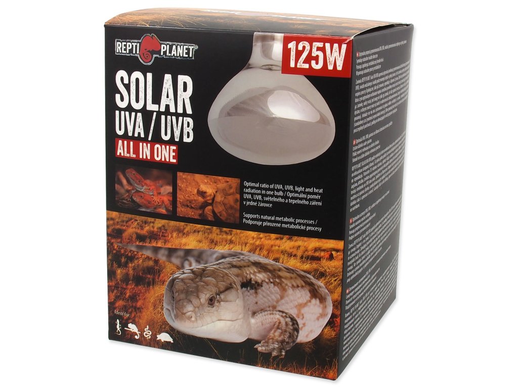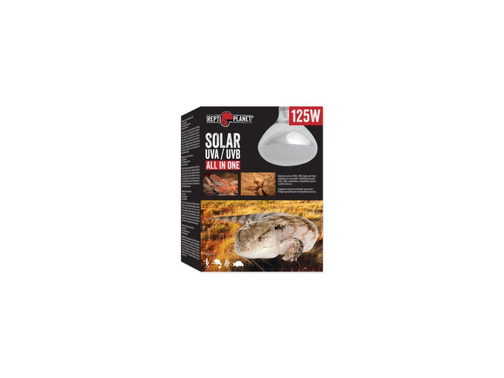 Žárovka REPTI PLANET Solar UVA UVB poskytuje optimální poměr ultrafialového světla (UVA, UVB záření), viditelného světla a infračerveného světla (tepla) v jedné žárovce. Jedná se o celospektrální žárovku, která podporuje fyziologické procesy jako je např. aktivita, příjem potravy a rozmnožování. Díky produkci vitamínu D3 napomáhá k optimální absorpci vápníku a zajišťuje tak správný vývoj a růst terarijních zvířat.