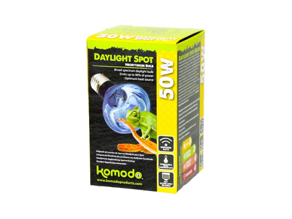 Komodo Neodymium Daylight Spot Bulb je terarijní žárovka s neodymem, vzácným kovem, který propůjčuje sklu namodralý odstín. Neodymové sklo eliminuje záření ve žluté oblasti spektra a vytváří tak přirozenější, bělejší světlo. Až 90 % spotřebované energie přitom vychází z žárovky v podobě tepleného záření, které lze díky konstrukci baňky směrovat na zvolené vyhřívací místo.