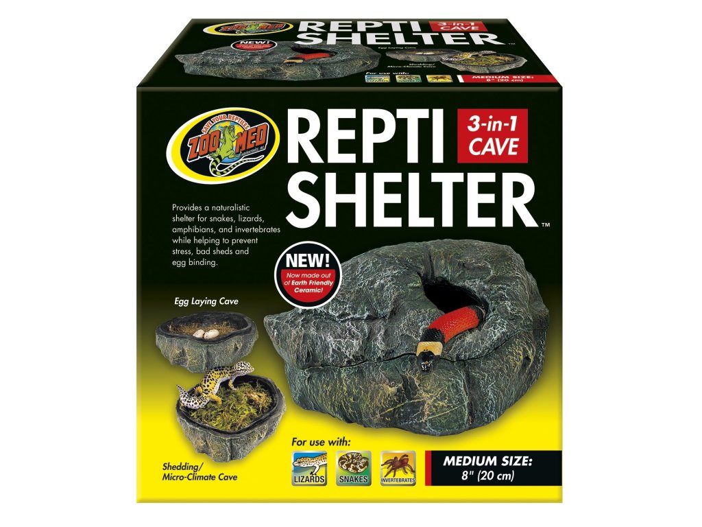 Zoomed skrýš Repti Shelter 3v1 Cave MJeskyně 3 v 1 může být vyplněná terarijním mechem nebo jinou terarijní vystýlkou, aby poskytla vlhké mikroklima pro vylučování, úkryt, nebo snášku vajec.